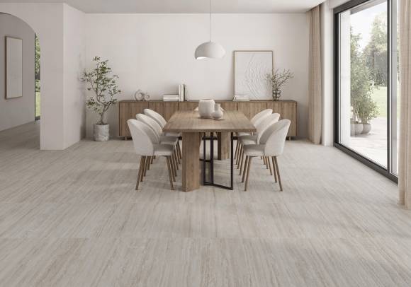 En este marco, Eterna reúne varias aproximaciones complementarias. Flavia interpreta el travertino desde un enfoque preciso y sereno: vetas horizontales o verticales que ordenan la mirada, tonos arena que aportan calidez y un relieve Rigata que introduce dirección y textura. Raffaello propone una lectura más orgánica, con vetas crema e ivory que envuelven el ambiente con elegancia suave. Nesta, la más expresiva, despliega vetas largas y fluidas que introducen movimiento y un gesto escenográfico contenido.