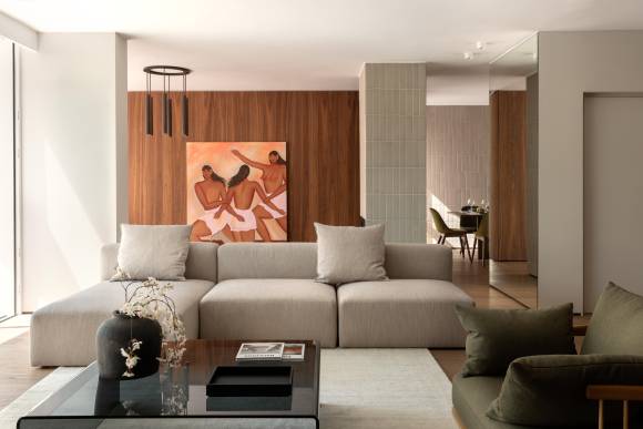 Sobre uno de estos paneles oscuros, junto al salón, la vista se enfoca en una colorida obra de arte pictórica de la artista belga contemporánea Ethel Coppieters. La cocina, resuelta con mobiliario de madera noble y una encimera en tonos grises suaves, prolonga la armonía visual que define toda la vivienda.