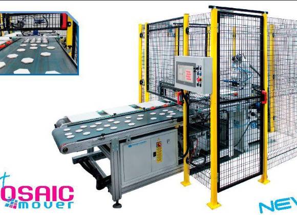 Gracias a la utilización de un robot, con un ventilado especial, Fast Mosaic Mover recoge las piezas del mosaico, cuando vienen del corte y las ubica en los moldes que irán, más tarde, a la máquina de encolado.