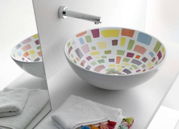 Mariscal recupera esta técnica y la aplica a sus diseños con un estilo muy personal. “Los trocitos de cerámica color pastel pensé que eran un buen motivo para decorar un lavabo. Al final un lavabo es como una piscina, piscina diminuta, que la tienes dentro de casa. Una piscinita con un mosaico casi casi romano” así lo explica el diseñador.