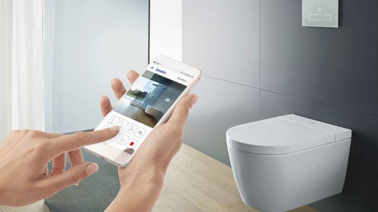 Si el SensoWash Starck f se combina con un bastidor de Duravit con un pulsador electrónico A2 se pueden ajustar además las funciones de descarga y la absorción de olores mediante el mando a distancia o la App.