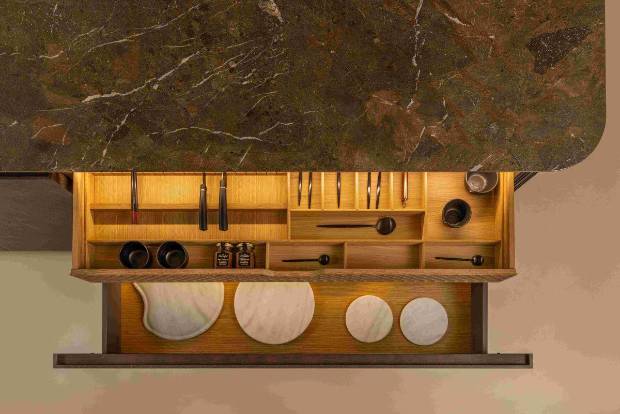 Sus frentes y puertas de 35 mm de grosor están elaborados con roble teñido y un revestimiento de MDi de Inalco