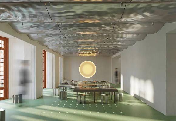 El elemento más innovador es un techo metálico curvo, serigrafiado con ondas concéntricas que evocan la caída de una gota de agua en un lago en calma. Realizado mediante tecnología robótica, dota al espacio de «una identidad única y resuelve al mismo tiempo su estructura».
