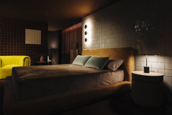 El montaje entrelaza cromatismos vibrantes y texturas estratificadas, construyendo una atmósfera íntima, pero de fuerte personalidad. Las excelencias españolas del mobiliario y de las superficies dialogan con el encanto atemporal del Palazzo Castiglioni, que se transforma en un marco escenográfico capaz de realzar y amplificar la visión proyectual.