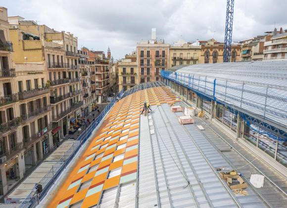 BARCELONA. El histórico mercado de la Abaceria de Barcelona encara la recta final de su transformación con la instalación de su nueva cubierta, una pieza clave del proyecto que combina tradición arquitectónica y sostenibilidad. Y lo hace mediante piezas cerámicas de colores con paneles fotovoltaicos integrados, que serán el emblema del edificio, que reabrirá sus puertas en el año 2026.