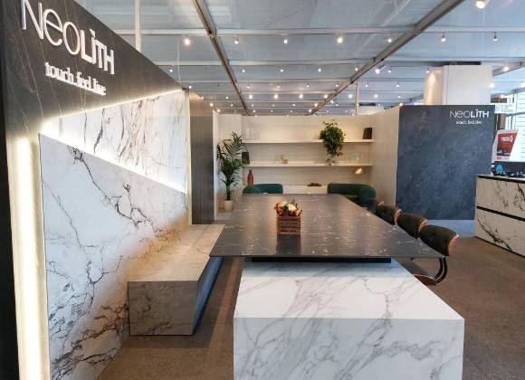 En el evento, la firma ha presentado un estand con tres espacios diferenciados con múltiples aplicaciones que dejan entrever las posibilidades donde las superficies de Neolith se pueden utilizar. Un lounge, una sala de estar y una cocina abierta forman parte del stand de la marca, con nuevos modelos de la colección The New Classtone como San Simone y Niagara, entre otros, que transmiten la fuerza y la belleza de la piedra natural en aplicaciones como encimeras de cocina, mobiliario para mesa principal, mesas auxiliares, elementos decorativos y revestimientos, así como cajones y armarios revestidos con los acabados más exclusivos.