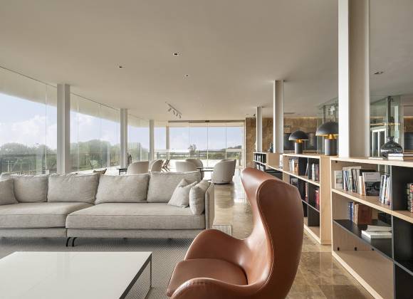 El vestíbulo se zonifica en cuatro espacios, que «aluden a las distintas partes de la restinga de la Albufera. Dentro de una atmósfera común de interiorismo, las piezas de mobiliario y decoración se adaptan en función de la actividad que se realiza en cada zona».