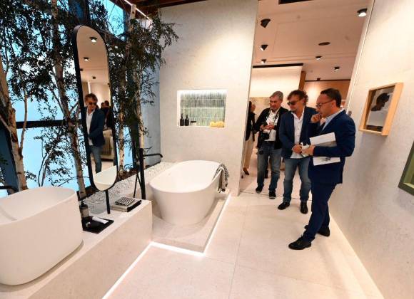 En la XXXII Muestra Internacional, el showroom de Porcelanosa Grupo -reúne las principales novedades de las diferentes firmas del holding empresarial- se reinventa a través de diferentes ambientes con inspiración italiana. La exposición cuenta con una iluminación especial, integrada en el suelo, que realza el relieve del pavimento cerámico generado con Halo. Esta nueva tecnología está especialmente indicada para el porcelánico de gran formato.